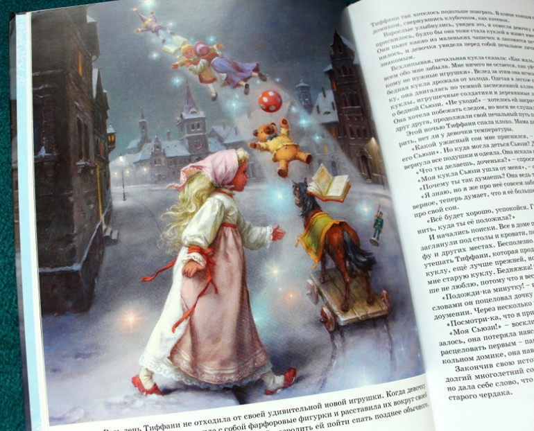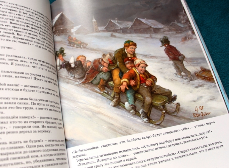 Сказки написаны очень простым языком, понятными оборотами. Кажется, что строчки поскрипывают при чтении в такт скрипу старинных жильцов чердака. Это завораживает! Эффект усиливается иллюстрациями будто бы списанными со старинных полотен. Каждая деталь на иллюстрации указывает на принадлежность к той эпохе - старой европейской деревушке с заснеженными мостовыми.