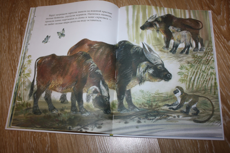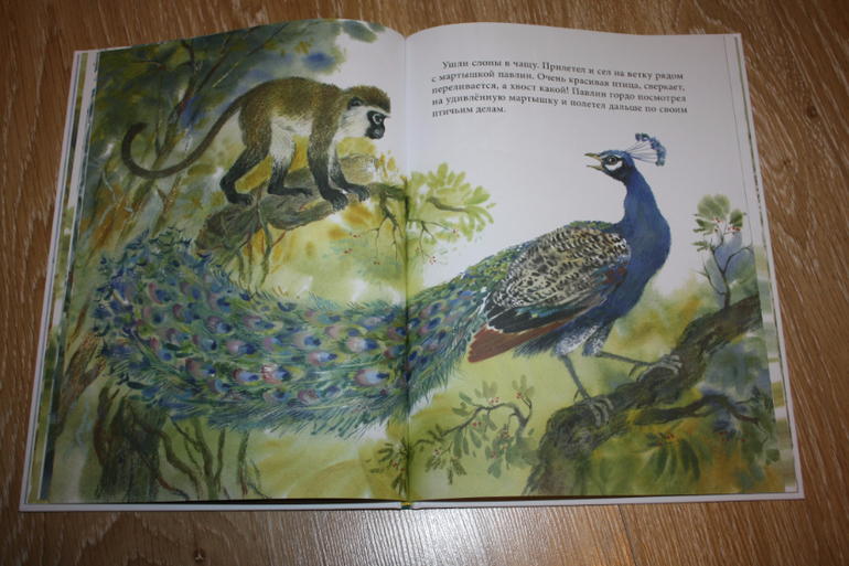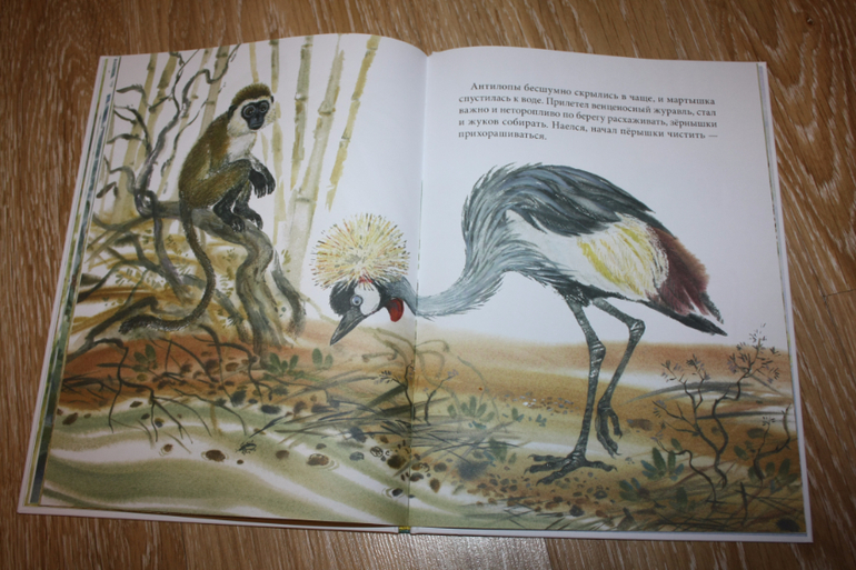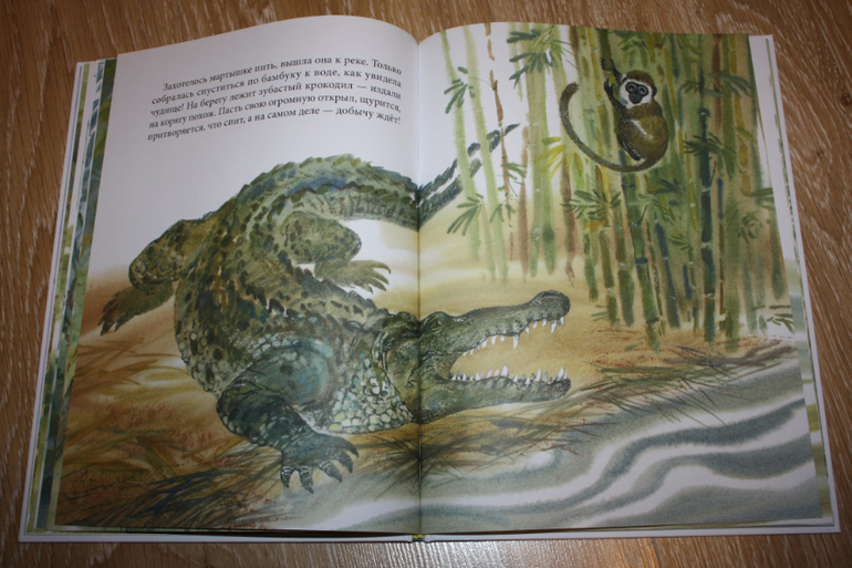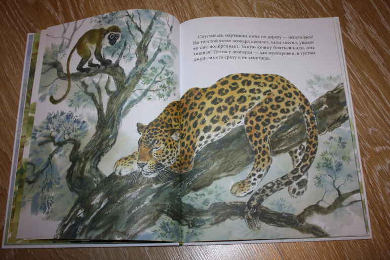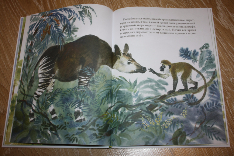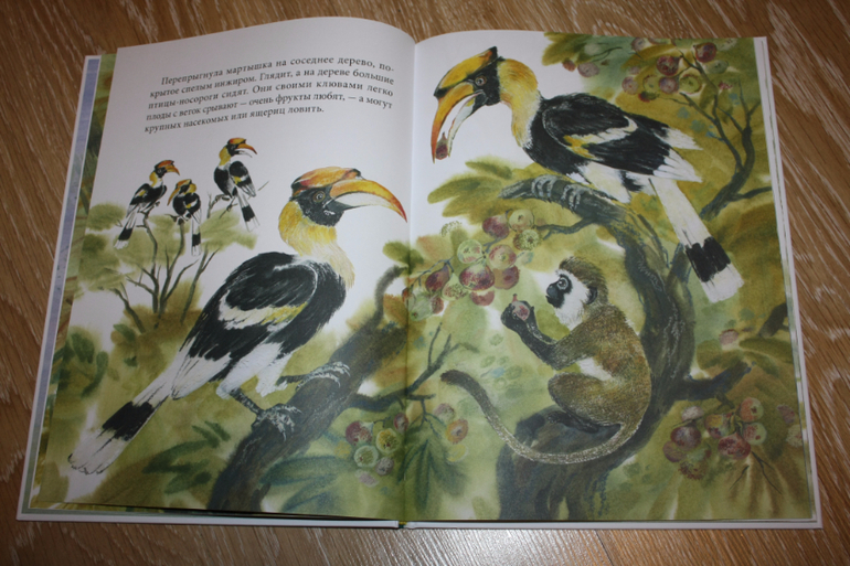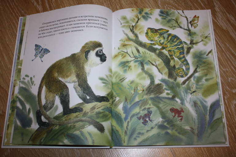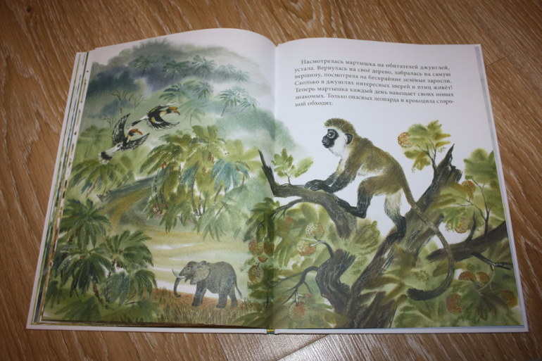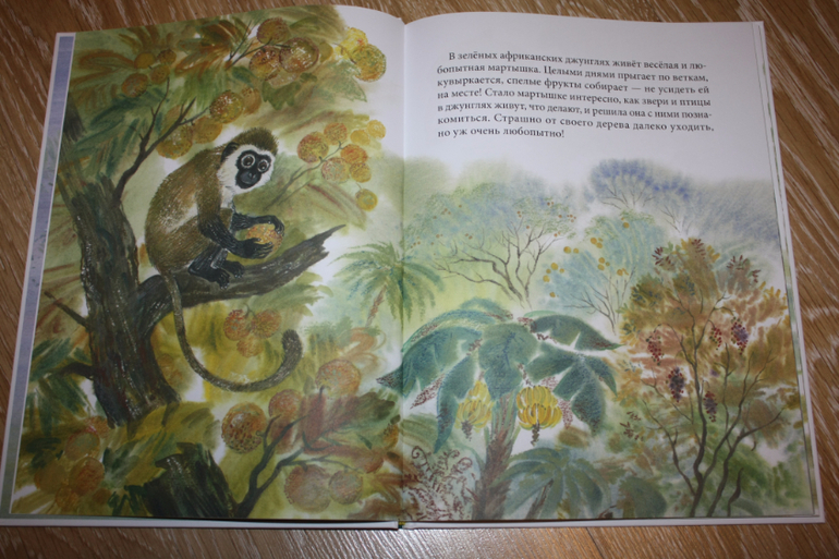 Текст простой, про обезьянку, которая решила познакомиться с жителями джунглей, про каждого зверя немного описания, и изумительные картинки на весь разворот!