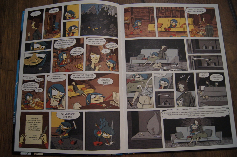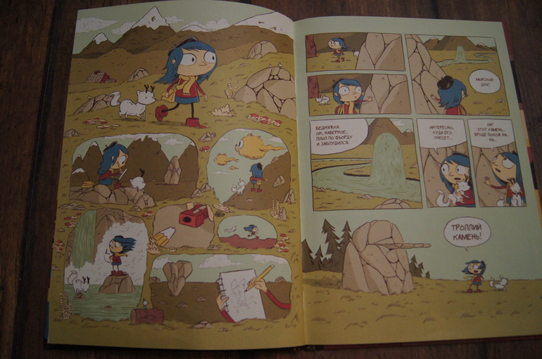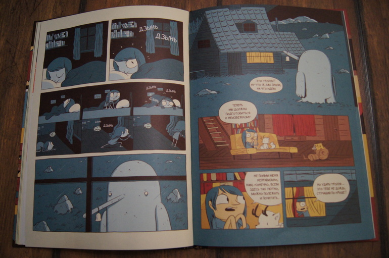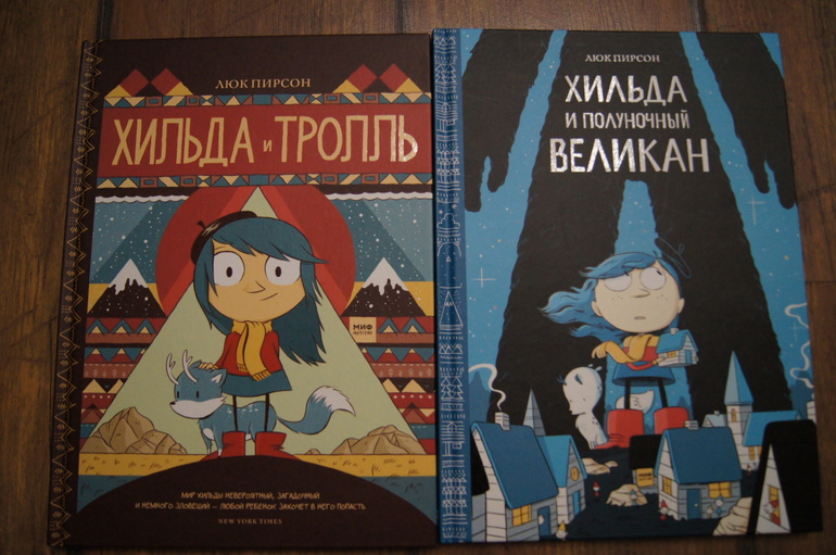 Первая книга из серии - "Хильда и тролль". В этой книге Хильда с Твигом решила прогуляться в горы и сделать зарисовки окружающих прекрасных видов. А до этого она читала страшную книгу про кровожадных троллей, которые днем превращаются в камень, а при заходе солнца становятся кровожадными монстрами, нападающими на людей. Профилактика появления троллей - колокольчики, которые необходимо повесить на выступ у камня, похожего на нос тролля и когда тролль пошевелится, колокольчик своим звоном, сразу даст знать, что тролль оживает. Так вот, вернемся к Хильде... Гуляла, гуляла она по горам и вдруг увидела камень, напоминающий тролля. И, конечно, ей стало просто необходимо его зарисовать, ну и чтобы узнать, когда тролль начнет оживать, Хильда повязала на его "нос" колокольчик. Вот с этого и начались ее приключения...