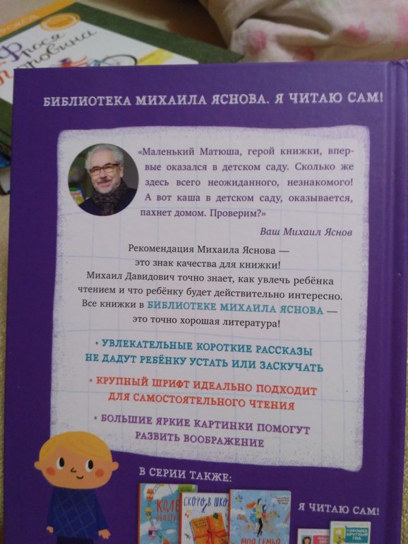 Как попала ко мне в корзину эта книга, вообще непонятно. Внешне она абсолютно клевером скачать, с их одинаковыми иллюстрациями. Наверное, имя автора подкупило- Ирина Заратайская. Текст абсолютно бесхитростный: мальчик Матюша впервые идет в садик. Собственно его первый день и описан. Сначала было грустно, но потом оказалось, что в садике не так всё и плохо.Очень просто, простыми предложениями. Без лишних описаний. Для взрослого покажется стилистически похожим на какой-то языковой учебник. Но может это и подкупает? Лесе книга однозначно понравилась. Просит читать про Матюшу.