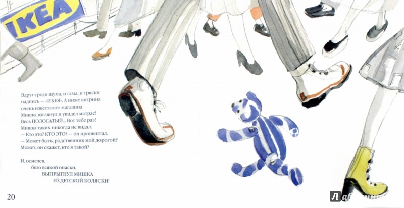 В этой стихотворной сказке всё начинается просто: девочке Саше дарят плюшевого полосатого Мишку. Появление нового друга не нравится таксику Сёме. Сёма убеждает Мишку, что полосатых медвежат не бывает, и не понятно, кто он такой. Чтобы «найти себя» Мишка пускается в длинное и опасное путешествие по Городу. На его пути и лабиринты «Икеи», и Рынок, и Ботанический Сад. А в это время пропажа Медвежонка становится настоящей трагедией для Саши и даже Сёма всерьез обеспокоен исчезновением.