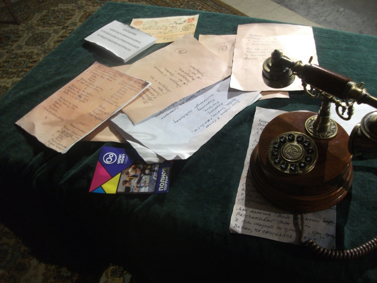 На столе ксерокопии черновиков, писем. По телефону голос Маршака читает стихи.