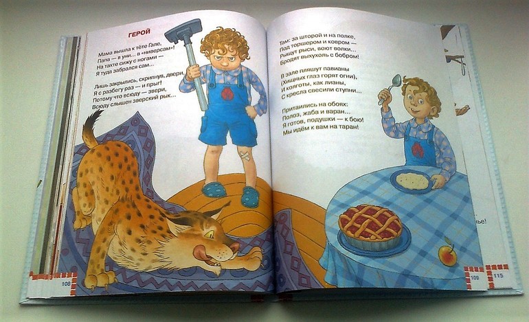 А вот этот стих мы прочитали три раза. Про мальчика, который ненадолго остался дома один и устроил воображаемое сражение с дикими зверями, атаковавшими квартиру. Это тоже в стиле Даши, она очень хочет быть героем и всех спасать )