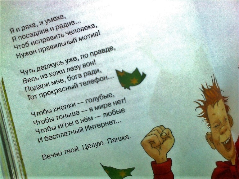 Вот этот стих мне меньше понравился, но тут реальная жизнь: я считаю, чем дальше и дольше держать ребенка от планшета и смартфона, тем лучше. А тут мальчик пишет письмо Деду Морозу и получает телефон в подарок. Моя пока рисует себе компьютер на куске картона. Рисуй, рисуй, детка )