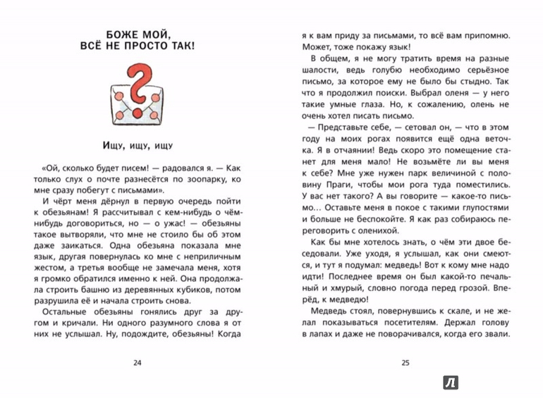 Книга Ондржея Секоры "Почта в зоопарке" знакомит читателей с одним храбрым и отзывчивым голубем, который, вместе с героем книги, налаживает настоящую голубиную почту в зоопарке Праги. Животным зоопарка очень нравится эта идея, и они начинают писать письма во все уголки земного шара. Из этих писем можно узнать, чему удивляются верблюды, какой сон увидела овечка, на что жалуется бегемот и ещё очень много любопытного.