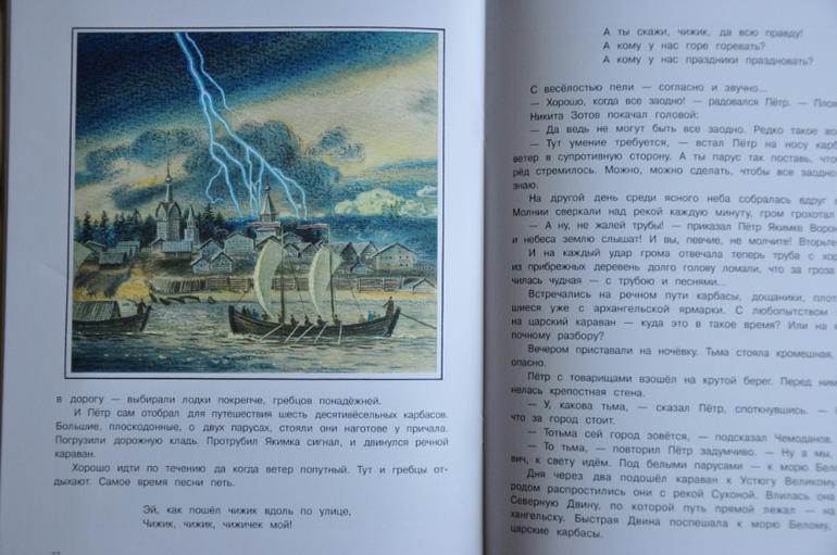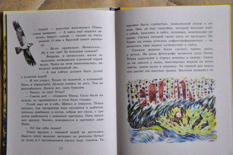История должна быть увлекательной - как на 7 лет мальчик получил подарок - поход с отцом в тайгу. И, конечно, не обошлось без трудностей, приключений. Пока полностью не читала. Но в общем - нравится. довольно ладная и не такая уж маленькая. Иллюстрации мне понравились.