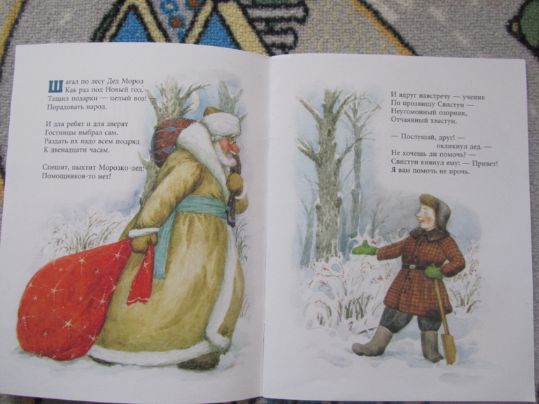 Знаю, что есть много недовольных этой книгой из-за того, как художница Людмила Пипченко изобразила в ней Деде Мороза, да он получился у неё не совсем "классическим", но мне это было не критично, вполне себе такой интеллигентный Дед Мороз ( и на Санту СОВСЕМ не похож). История про мальчика, который, помогая Деду Морозу разносить подарки, перепутал что кому дарить , так как был неграмотный и не смог прочитать надписи на подарках. Стихотворение забавное, сыну понравилось, в конце сам мне говорил, что кому надо было подарить. Стихотворение с моралью, что надо учиться и не надо лениться, и тогда не попадёшь в неловкую ситуацию ))). Иллюстрации хорошего качества, на каждой странице, в уже узнаваемой манере Людмилы Пипченко ( мне её работы очень импонируют). Книга подойдёт для деток от трёх лет и до младшей школы точно )).