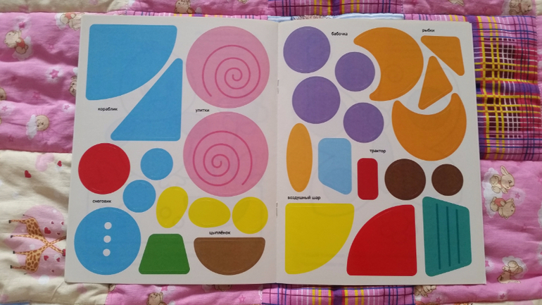 В этой серии 4 альбома. Отличные! Думаю купить впрок для второго ребенка )) У нас были все 4. От каждого листа нужно отрезать шесть элементов и их наклеить на рисунок. Два типа заданий: есть нарисованные штриховкой квадратики (как на фото разворотов), а есть картинки без этих квадратиков - клей куда хочешь. Еще на обратной стороне листа есть стих на тему картинки. И цена адекватная.