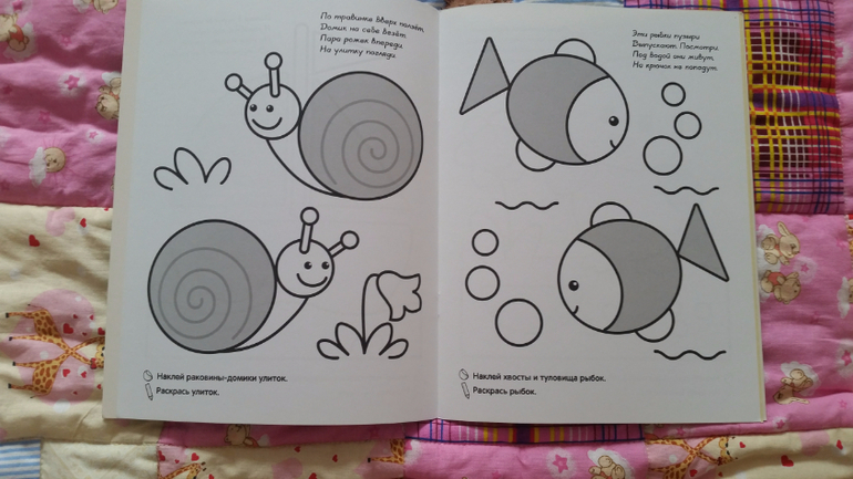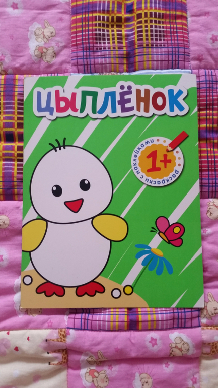 Мне очень понравилось, что тут комбинация: и наклейки и раскрашивать можно. С заявленным возрастом не соглашусь, т.к. в год вряд ли кто сможет раскрашивать более-менее в рамках картинки. Наклейки мы наклеили как раз года в два и отложили. Недавно нашла эту тетрадь и стали раскрашивать)