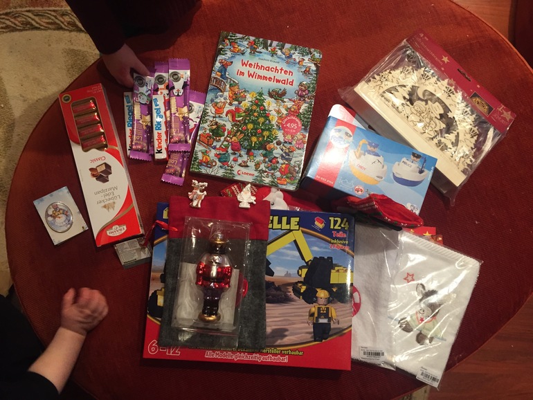 Чего там только не было!😳 Сладости для детей и взрослых, красиво упакованные в рождественские сапожки, елочная игрушка Щелкунчик, в выходные повесим! Конструктор со строительными машинами для старшего, лодочки для младшего, чудесные полотенчики для обоих. Деревянная инсталляция с огоньками, сначала я подумала это держатель для салфеток, а потом увидела проводки. Поставили ее на окно и создаём настроение соседям)) а ещё красивущий рождественский виммельбух и открытки!
