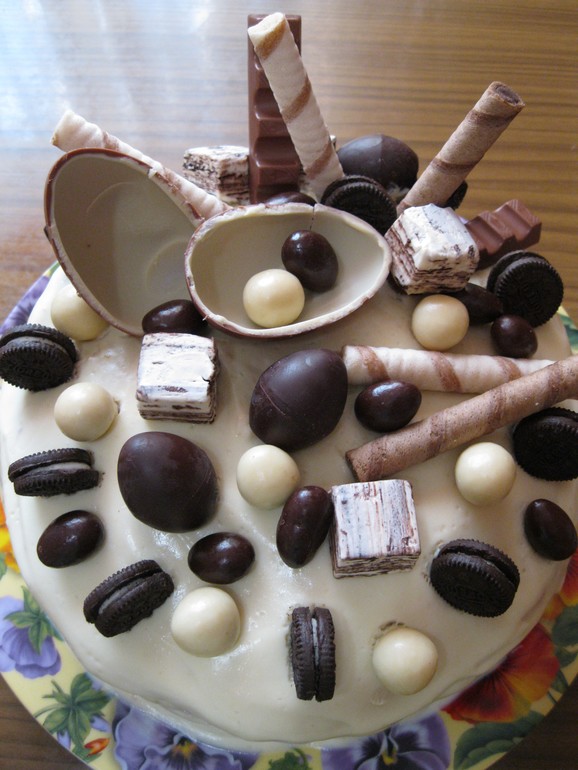 Торт - обычный медовик (я вообще только его и умею печь), просто сверху положила много вкусного - конфеты полосатые, орехи в белом и молочном шоколаде, вафли, печеньки орео-мини.
