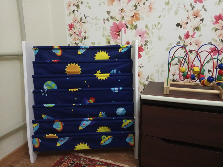 Мы использовали доски от старого стеллажа. Они были не в лучшем состоянии, поэтому пришлось обклеить их клейкой бумагой. Вместо деревянных палок мы использовали кухонный рейлинг. На распил досок, их обклейку, распил рейлинга и просверливание дырок у мужа ушел один день с неполной занятостью и один час сегодня. На пошив чехла у меня ушел один вечер, хотя опыт шитья у меня минимальный, но тут нет ничего сложного. Я шила не с выкройки на фото, а с "натуры": прикладывала наши книги и булавками закалывала ткань. Я так делала потому, что у нас книги разных форматов, поэтому сделала кармашки разной глубины. Внизу я сделала кармашки для карточек, которые у нас обычно тоже валялись где попало.