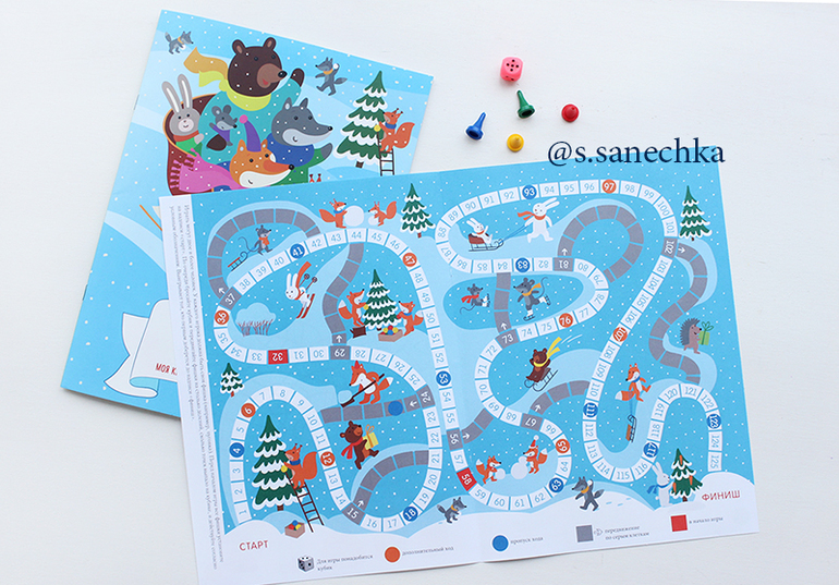Мелочь, а приятно, зимняя игра бродилка на весь разворот. Что самое интересное, то Саше так понравилась игра (хотя бродилок у нас много, но видно зимняя тематика сделала свое дело), что играем в нее каждый день. Имейте ввиду, кубик и фишки в комлект не входят!