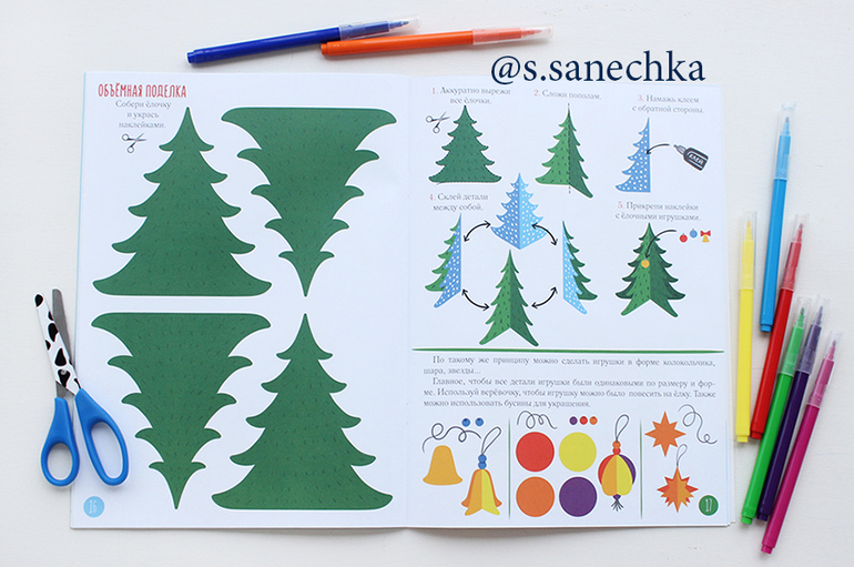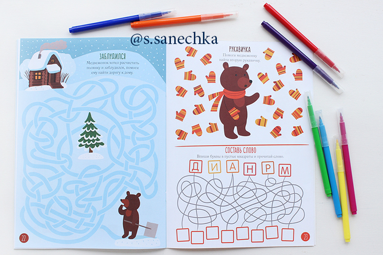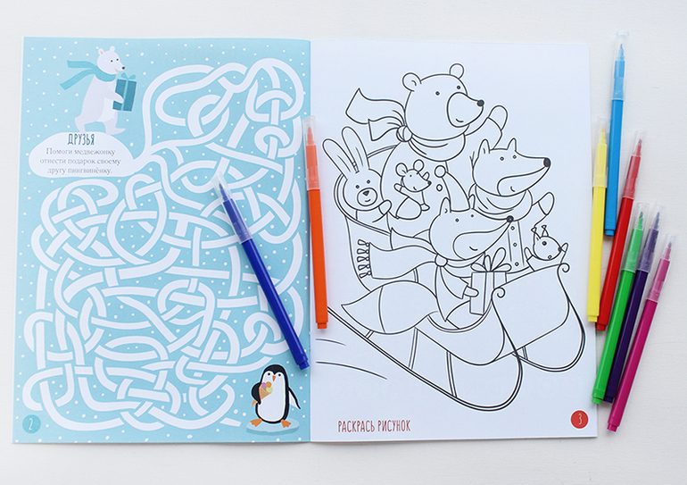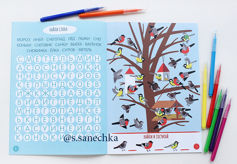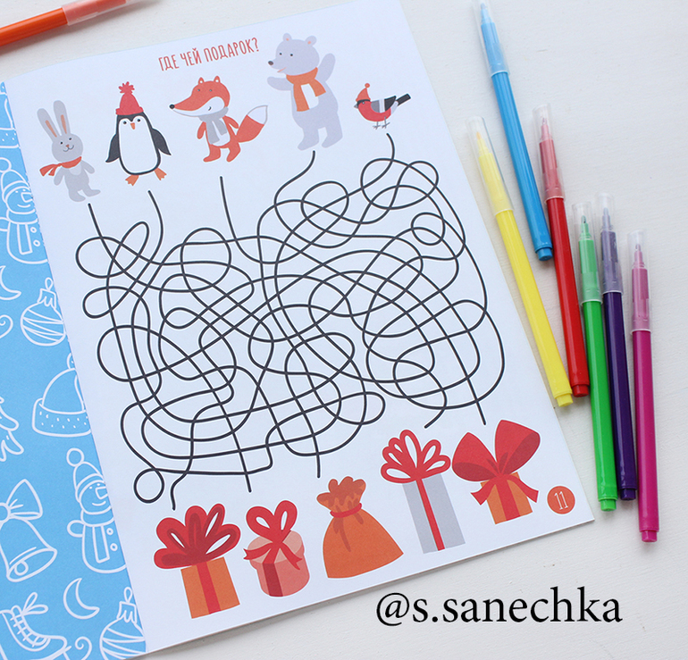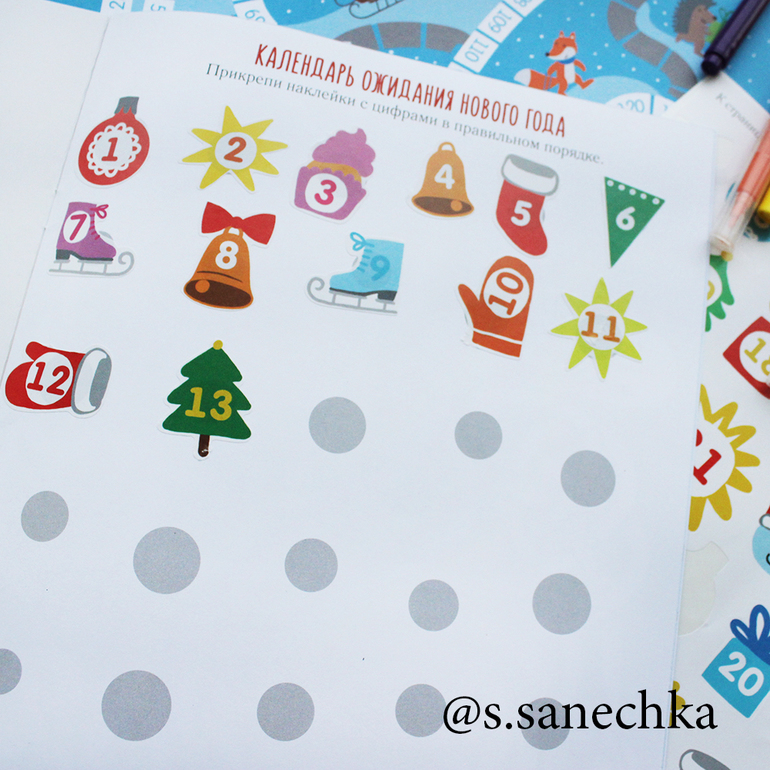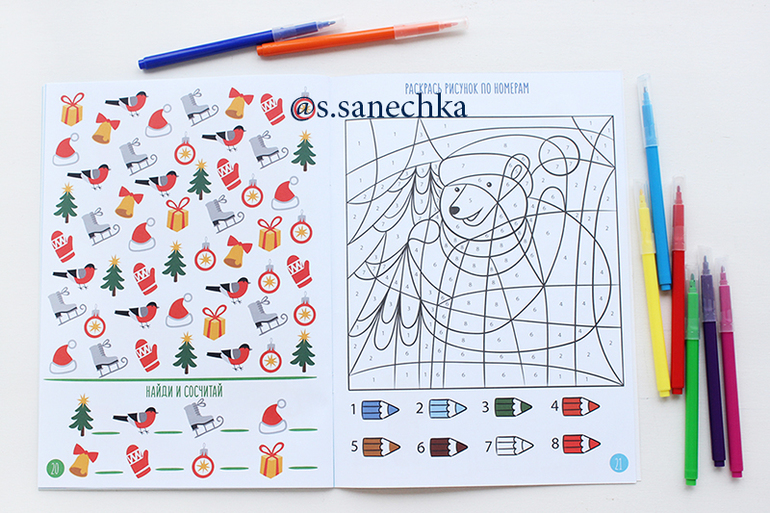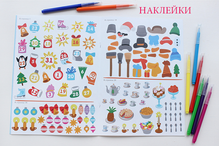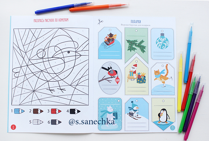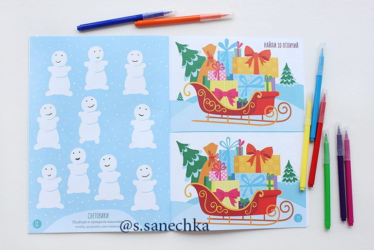 Задания разнообразные: календарь ожидания нового года с наклейками, лабиринты, проводилки,творческие странички с наклейками (например украсить снеговиков), задания на поиск слов, счет, найти отличия, раскраски обычные и по номерам, ребус и даже творческие странички где нужно вырезать бирочки для подарков и склеить 3D ёлочку (а потом украсить ее наклейками). А приятным бонусом вы найдете игру бродилку на полный разворот. Смотрите сами.