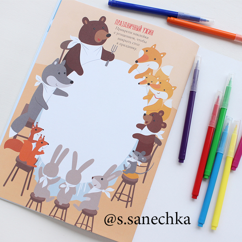 На последней страничке предлагается накрыть праздничный стол зверятам (наклейки прилагаются).