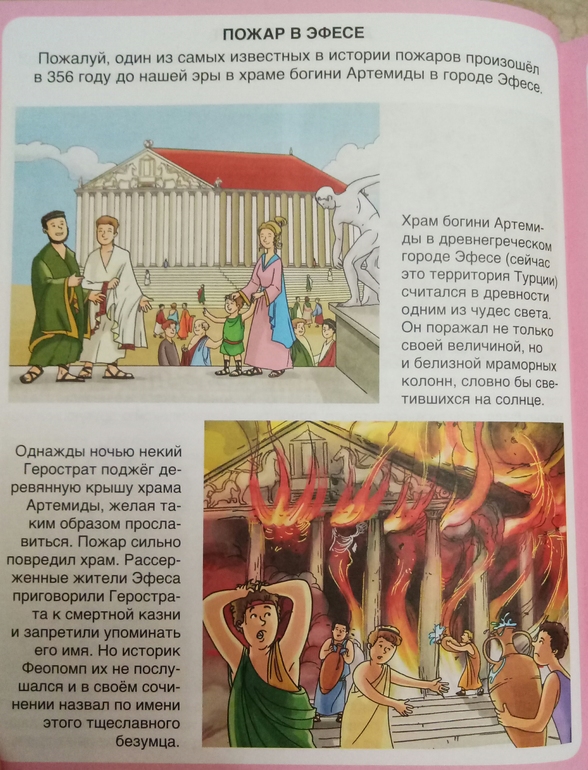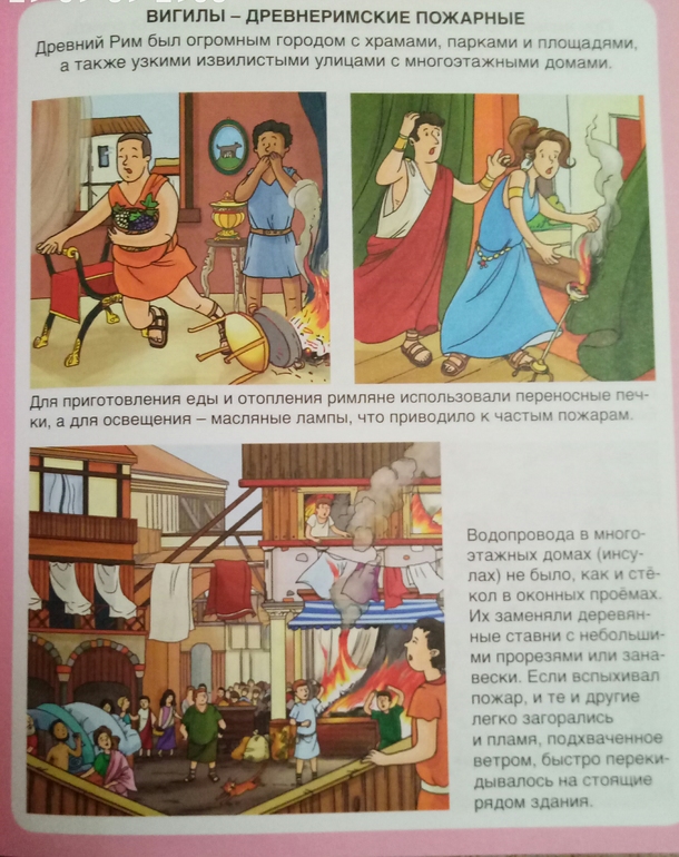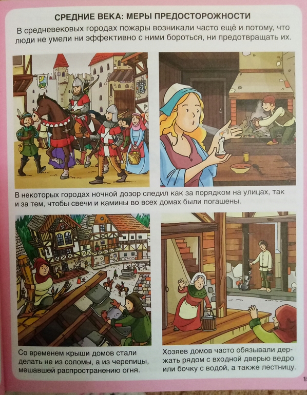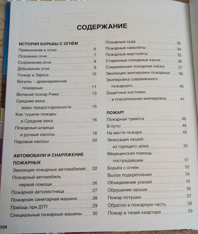Чего там только нет!Начинается все с истории огня, как добывали, как хранили, как боролись с огнем в древние времена. пожары были совсем нередки, что не удивительно, свечи, переносные печки, масляные лампы, отсутствие водопровода очень этому способствовало..