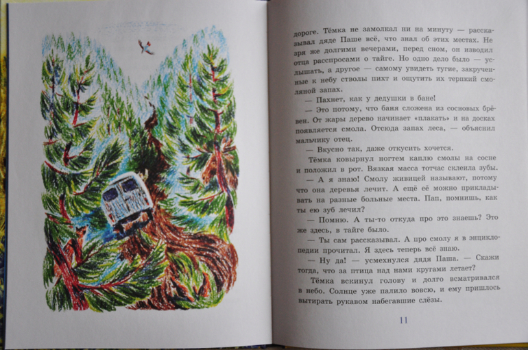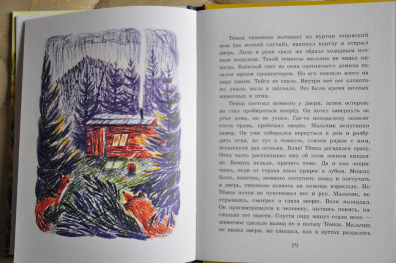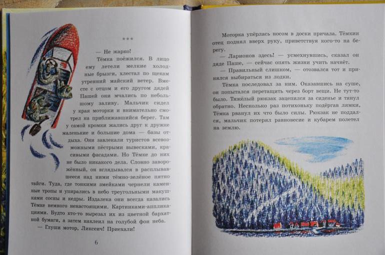 Мне книга, наверное в первые, никак. Вообще. Прочли. Поставила. И даже забыла про нее. Когда смотрела ее по сканам в Лабиринте, то история про мальчика, который впервые идет с папой на пару дней в поход в тайгу интриговал, выложенные кусочки цепляли фантазию, но в итоге история показалась скомканной, похожей на набросок, план к сценарию, например.