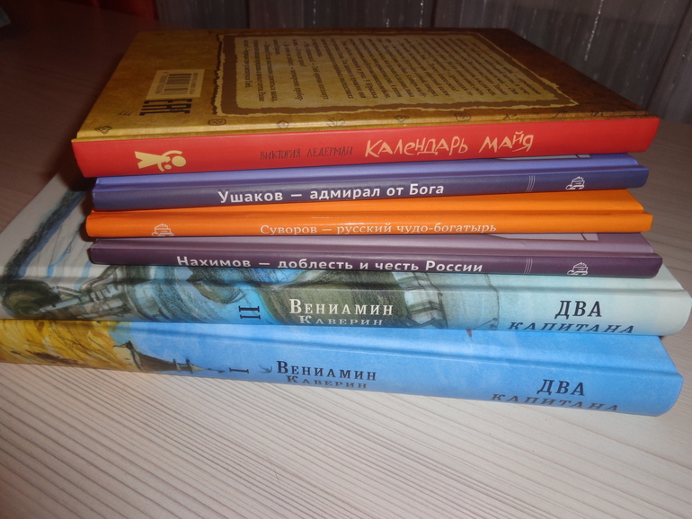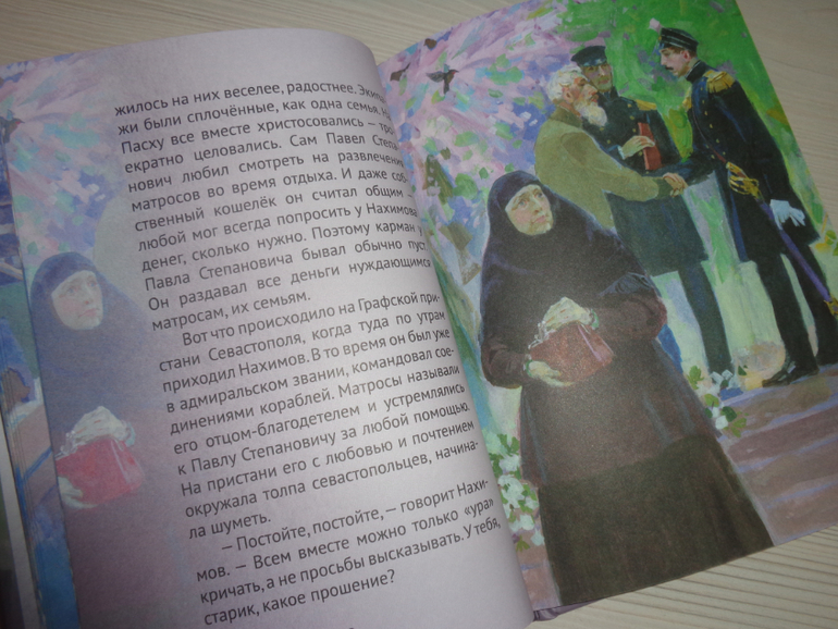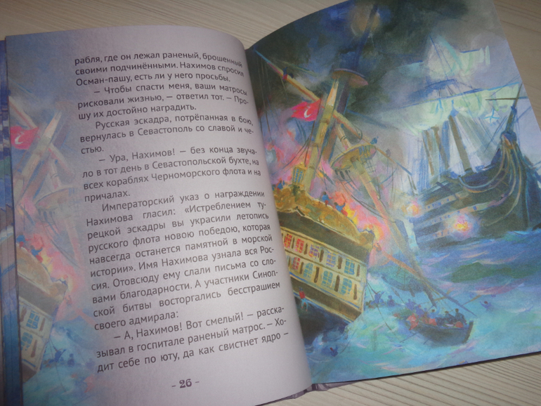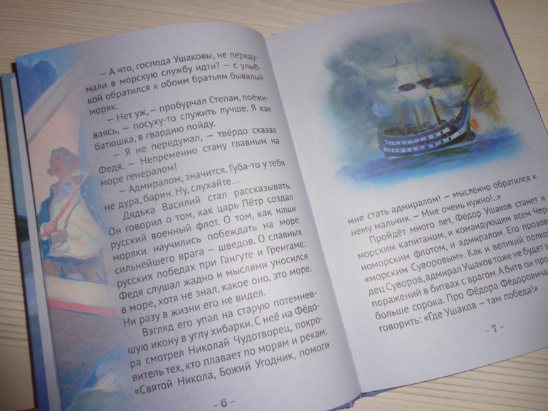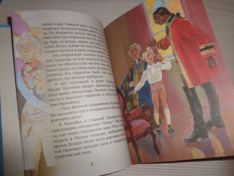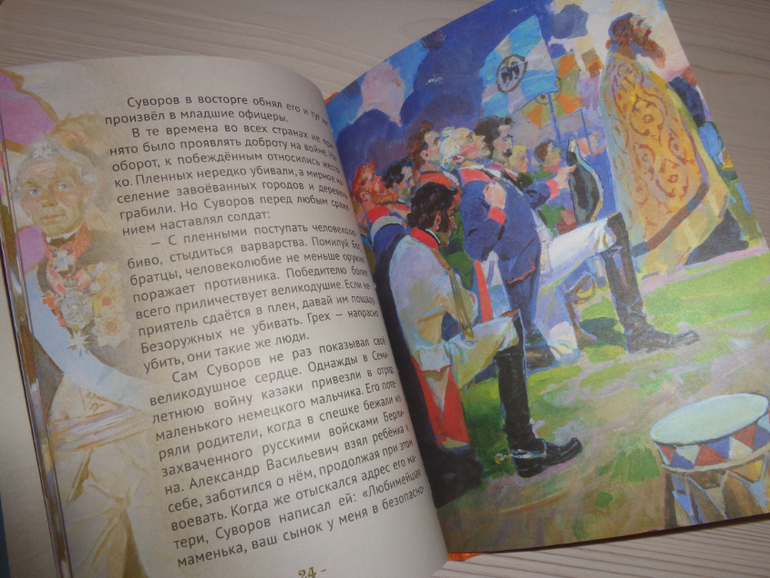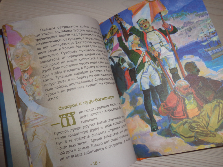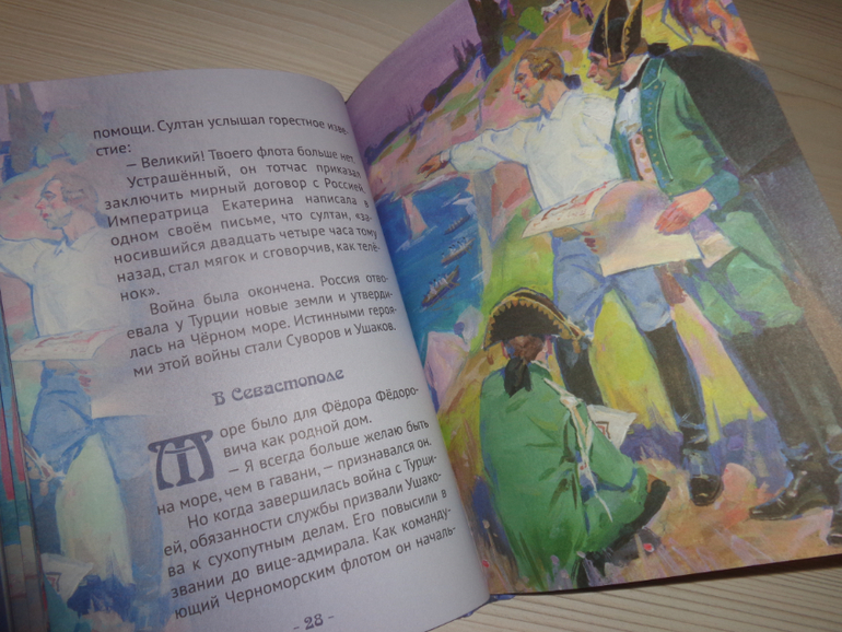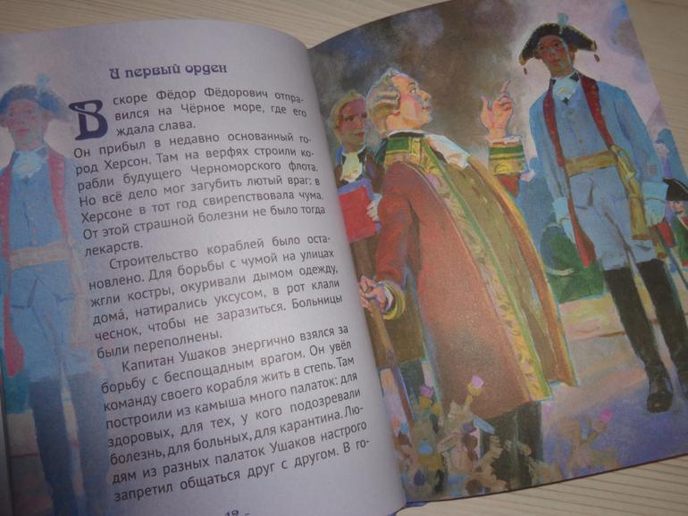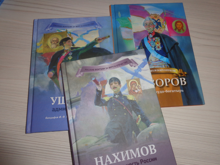 Серия книг Русские воители на веру и Отечество. Всего в серии вышло 3 книги, если читать в хронологическом порядке, то следует так - Суворов, Ушаков, Нахимов. Я не была знакома с биографиями этих великих людей (стыд мне и позор), но с радостью наверстываю упущенное! Сами книги небольшого удобного размера, 2 в твердой матовой обложке, у Суворова обложка глянцевая. Форзацы и нахзацы разные, цветные. Внутри плотный тонированный офсет, не просвечивает. Шрифт яркий, достаточно жирный и крупный. Иллюстраций немного - где-то 5-6 полностраничных и по 2 на пол страницы. Вроде немного, но эти иллюстрации повторяются в размытом виде на полях, поэтому кажется, что книга полностью иллюстрирована. Понравилось, что опечаток нет (ну или не нашла).