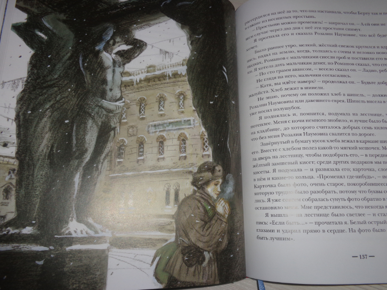 Но читала роман я не гладко. Мне не хватило драматизма, сложностей осажденного Ленинграда - как-то слишком уж свободно герои передвигались, как-то все благополучно у них складывалось. И еще. Главы, написанные от лица Кати мне понравились меньше написанного от лица Сани. Я совсем далека от образа и характера главной героини - ее мысли, ее выводы, поступки для меня необъяснимы и нелогичны, хотя, наверное, только такую девушку и мог полюбить капитан Григорьев)
