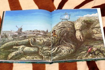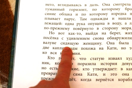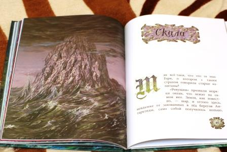 Мне не понравилось вот что: иллюстрации в большинстве своем очень темные, по смыслу они предваряют главу, сам текст вообще без иллюстраций, поэтому когда читаешь книгу впервые вообще не понятно, к чему иллюстрации, а после прочтения главы приходится возвращаться и рассматривать картинку. Вообще иллюстрации довольно странные. И тексту не всегда соответствуют: например, в тексте написано, что каменная женщина сидит на валуне, а на иллюстрации - лежащая каменная женщина. А то, что туловище женщины на одном развороте, а голова на другом - я вообще не поняла этой фишки. Зачем скала изображена дважды - на развороте и сразу на следующей странице на пол разворота. Что за чудо-юдо рыба-корабль в небе? Вступление книги (текст "старинным" шрифтом на флаге) прочесть очень сложно даже взрослому человеку. Но вообще шрифт в книге крупный, подойдет для самостоятельного чтения детям. История меня не особо впечатлила. Много описательного, мало экшена. Запах краски присутствует. Можно было не покупать, взять в библиотеке, почитать разок, другой. Перечитывать многократно вряд ли будем. Посмотрим, что скажет сын, когда дорастёт до неё.