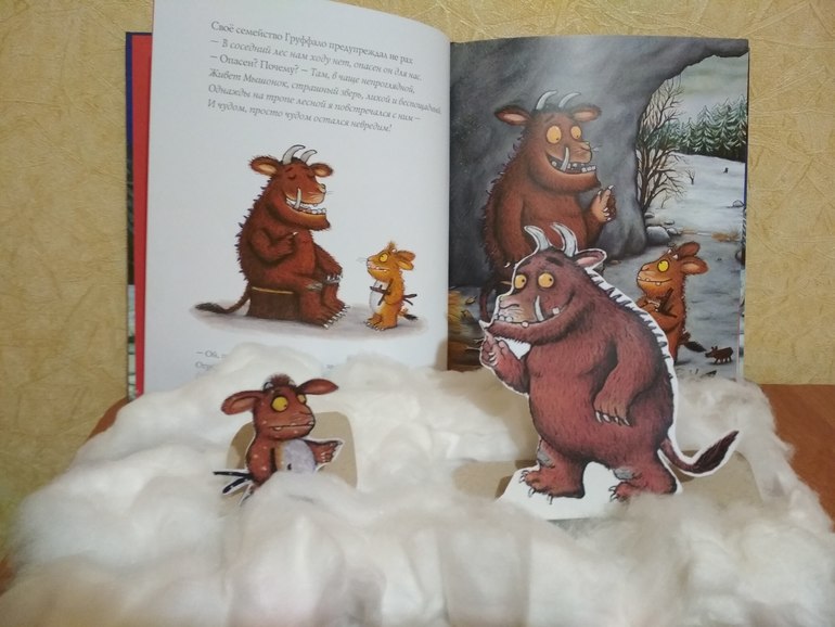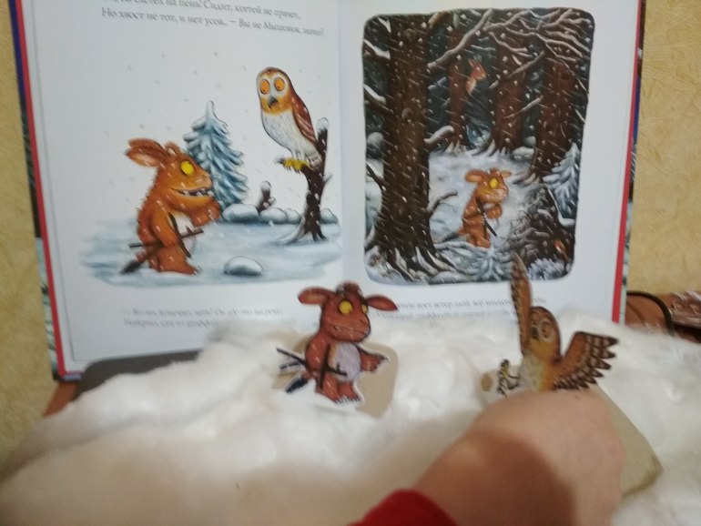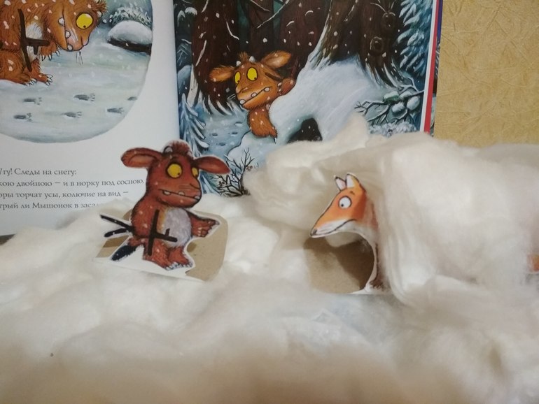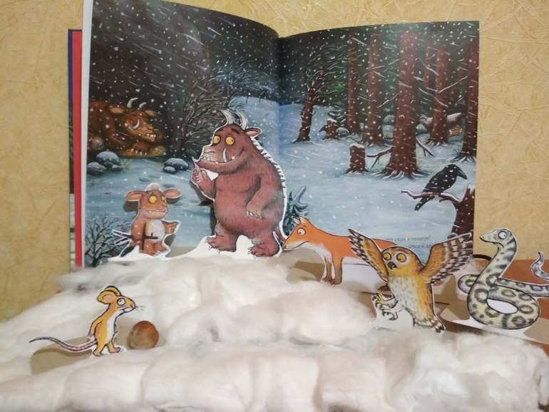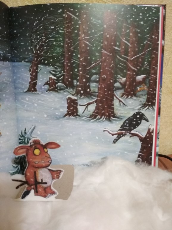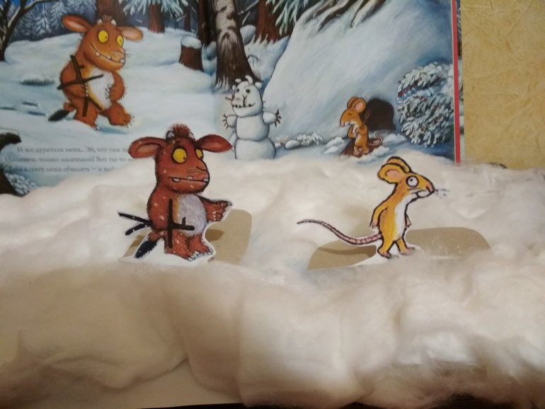 Рисовать декорации дочь не стала, а предложила просто воспользоваться книгой и ватой, по-моему вышло неплохо.