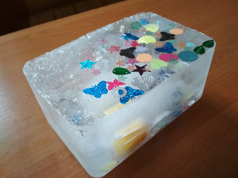 Растопив лёд, Маша нашла маленькую фигурку собачки, конфеты и записку в яйце. В записке предлагалось поискать в духовке. Дочь обшарила всю плиту на кухне, даже в микроволновку заглянула. Только с моей подсказой вспомнила про свою игрушечную кухню,