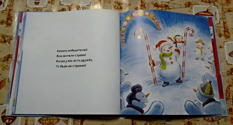 Небольшая книжка с небольшой историей про снеговиков и пингвина. И тех и других сын очень любит, поэтому книжку слушал спокойно, никуда не убегал. Картинки в книге красочные, крупные, текста немного и он стихотворный, читается легко и быстро. Очень хороший вариант для зимнего чтения с детьми двух - трех лет.