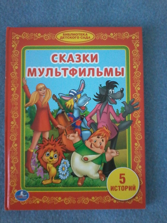 Сказки-мультфильмы. Очень яркая книжка с хорошими сказками-мультиками: бременские музыканты, ну-погоди, паровозик из Ромашково, про ежика и медвежонка и песенка Карлсона. Особенно нравятся про паровозик (что не удивительно ни капли) и бременские музыканты (подозреваю что из за повозки на колесах на картинке).