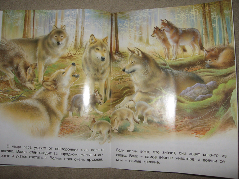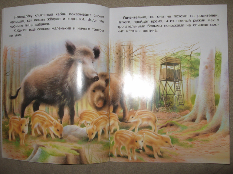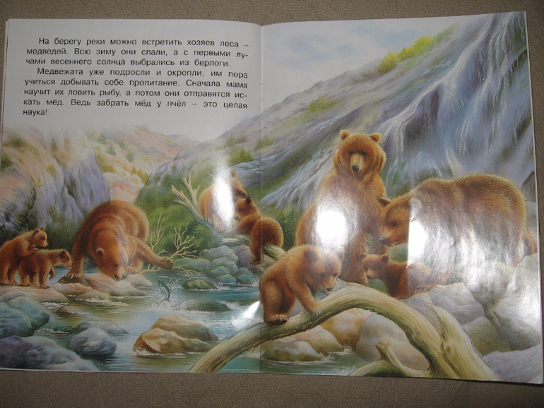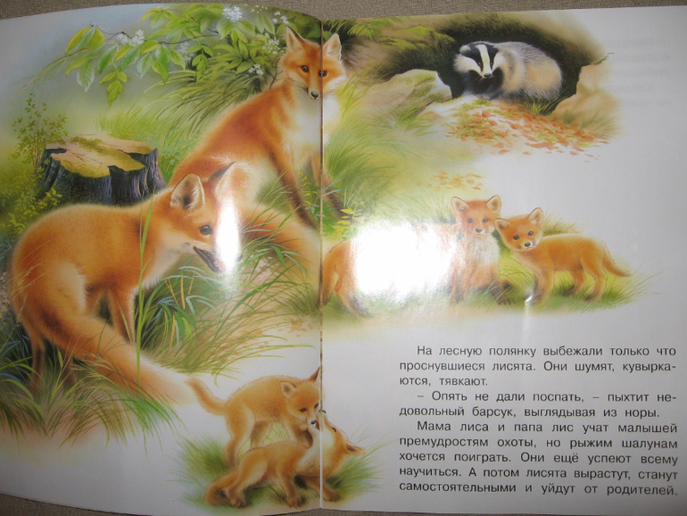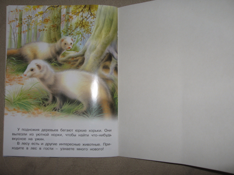 Текста в этой книге также немного, шрифт такой же крупный и удобный для самостоятельного чтения. Сюжет и в этой книге особого нет, так же нет и каких-то интересных фактов о лесных жителях. Каждый разворот - это большая красочная иллюстрация, а к ней коротенький текст с обозначением животных и птиц, которые изображены на рисунке. В общем-то, для самостоятельного первого чтения больше и не нужно (нам, по крайней мере, в самый раз). Если дети уже бегло и хорошо читают, то эти книги им, скорее всего, покажутся скучными. Рисунки красивые и реалистичные, в этом плюс. Единственное замечание у детей было по поводу белочки. на обложке она есть, а внутри про нее ни слова. Развороты так же покажу полностью, чтобы можно было посмотреть и оценить качество и нужность книги. Для себя пока решила ограничиться этими двумя. Бумага мелованная, поэтому за блики извиняюсь)