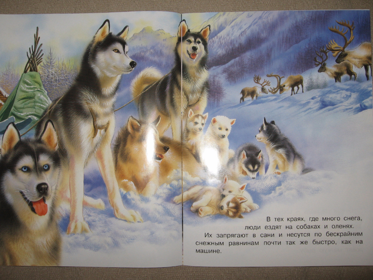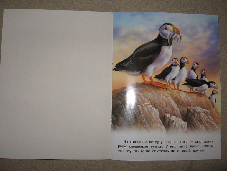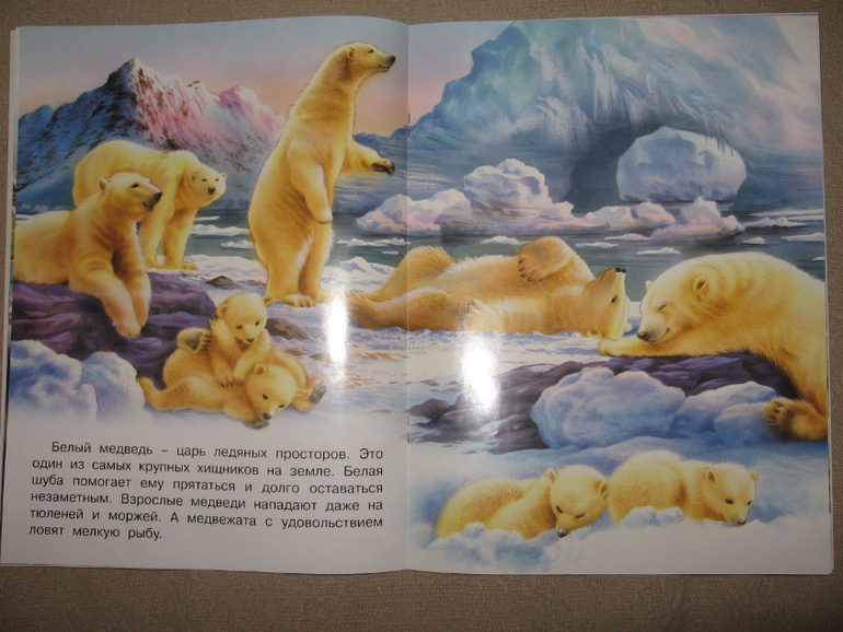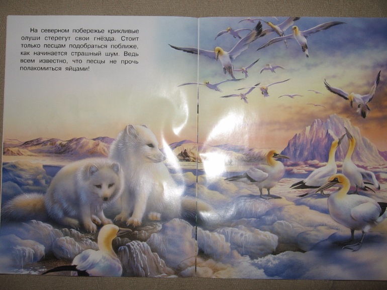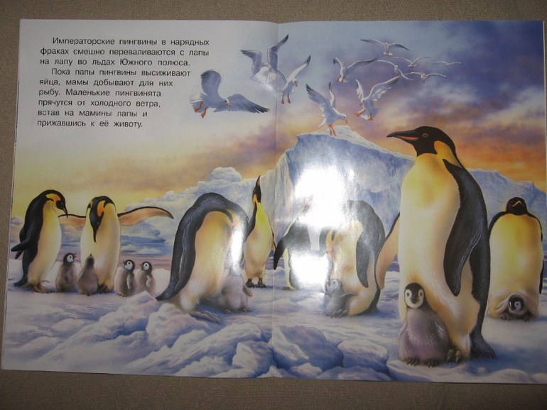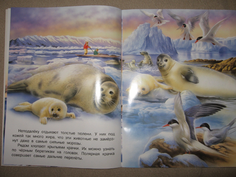 Текста в книге мало и он достаточно крупный и четкий для самостоятельного чтения. Это даже Егор заметил. Мол, о какие буквы крупные, можно и самому почитать)) Сюжет в книге нет, каждый разворот - это отдельная заметка о том или ином животном/птице. Причем название "На полюсе" особо сути книги не отражает, внутри собраны просто наиболее известные животные, обитающие среди снегов и льдов, как Северного. так и Южного полушария. Упоминаются даже собачьи и оленьи упряжки. А в самом конце книги упоминаются даже наши воробьи и синички, которым с приходом зимы требуется помощь и забота в виде подкормки. В книге, конечно же упоминается, что пингвины и моржи обитают рядом только на страничках книги, а на самом деле живут совершенно в разных полушариях, а тут они встретились по той лишь причине. что живут в схожих суровых условиях.