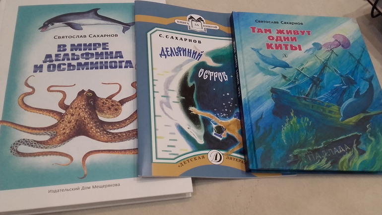 Сахарнов -это совместное желание, очень понравились его книги, интересные, живые. Конечно Здесь живут одни киты и Дельфиний остров на вырост, а вот В мире дельфина и осьминога сын утащил сразу и долго рассматривал, очень рекомендую любителям морских обитателей.