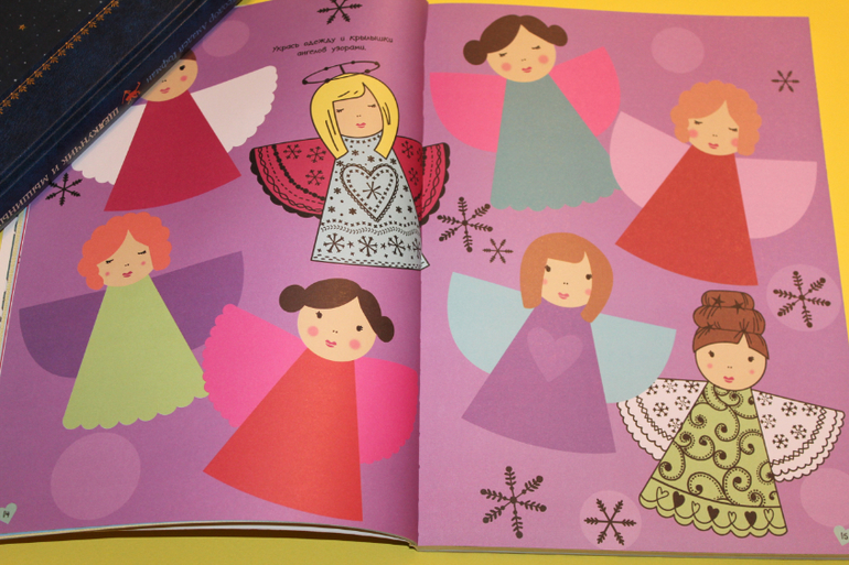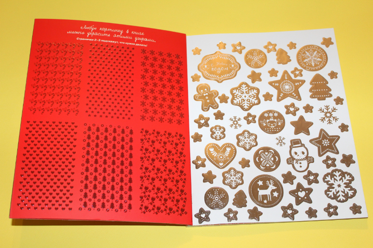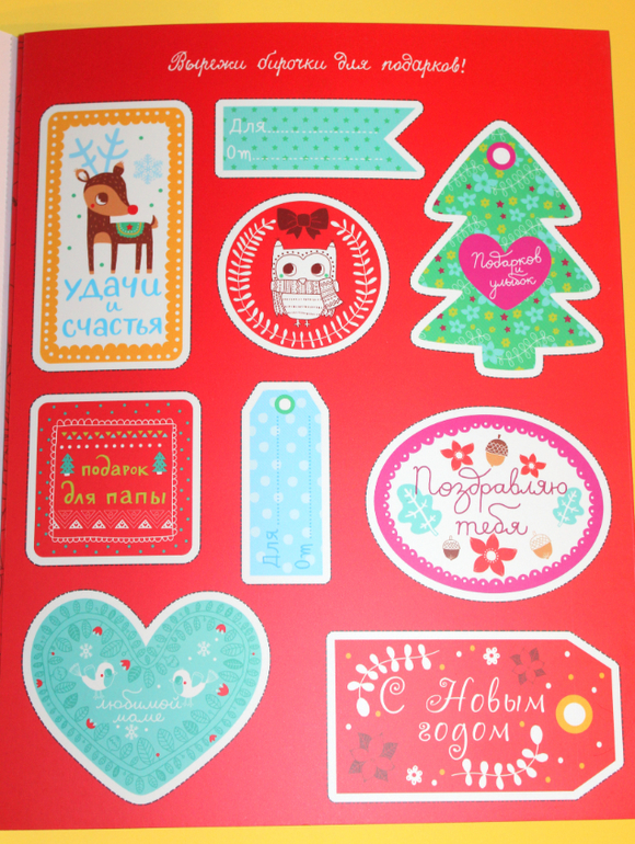 Двойная обложка тоже кроет в себе сюрпризы. На одной расположены шесть видов узоров. Каждое изображение выпуклое, поэтому, если сверху на рисунок положить листок и закрасить, то узор переведётся на лист. На другой стороне обложки яркие бирки для подарков, но дочка пожалела их вырезать)).