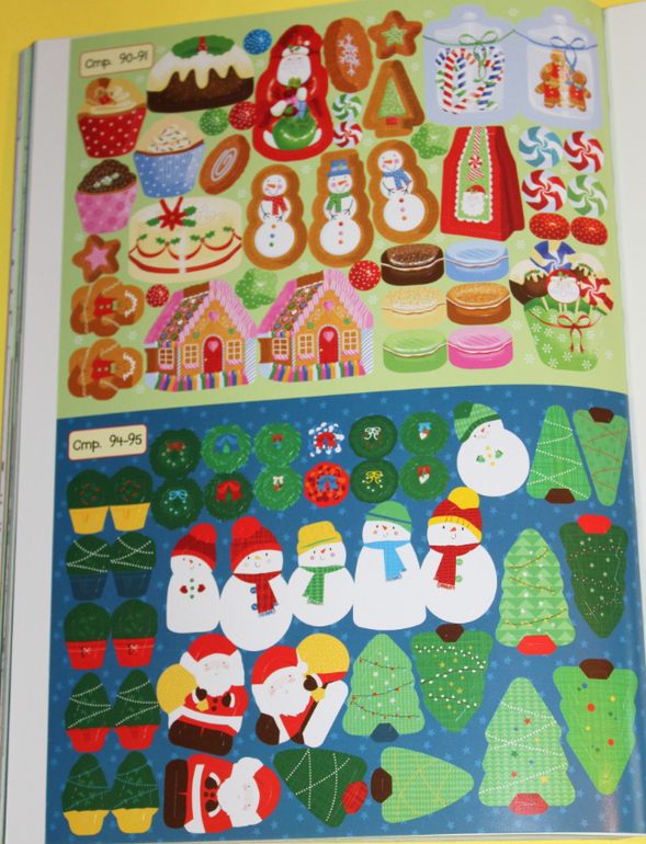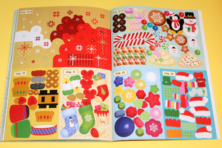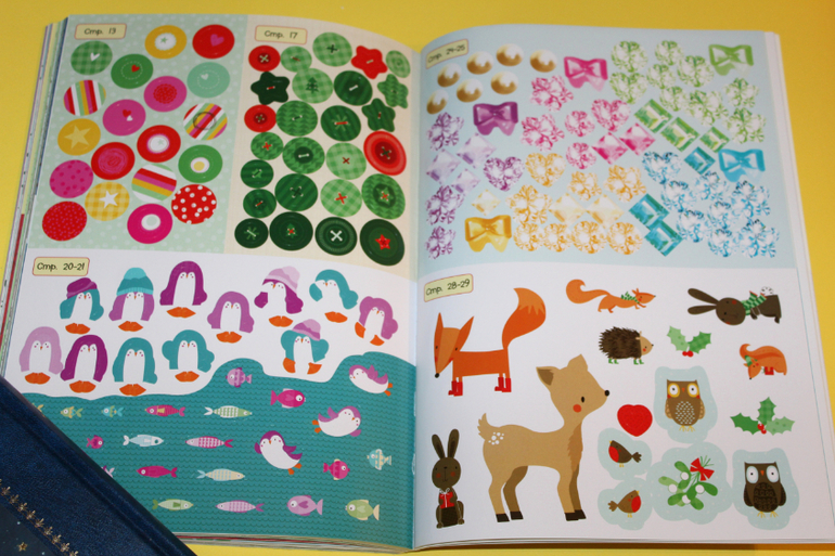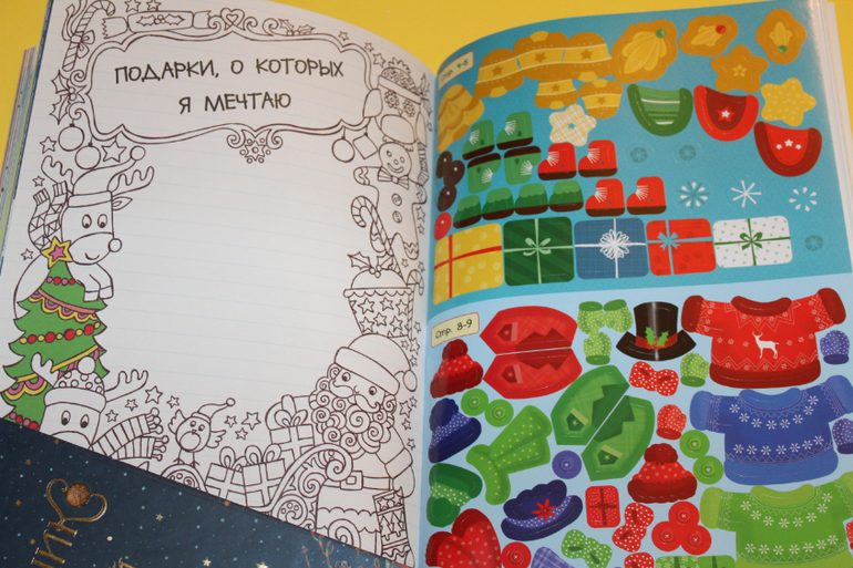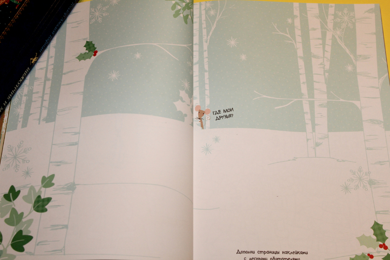 Главное развлечение книги, конечно, наклейки. Ими предлагается украсить почти каждую страничку: одним оленям нужно наклеить попоны и сапожки, другим приклеить носы, одеть снеговиков, подарить им подарки, нарядить ёлочку, расселить животных в зимнем лесу и ещё много-много разных заданий с наклейками.