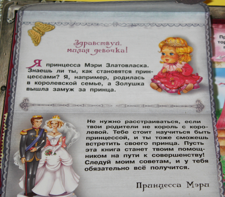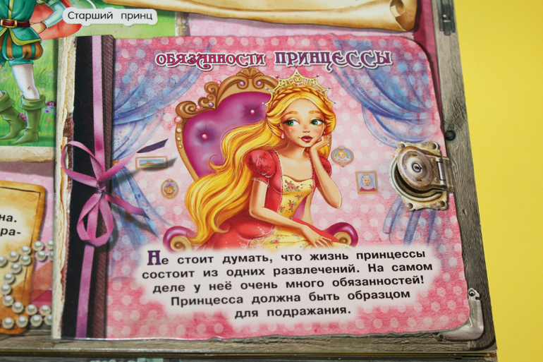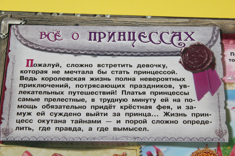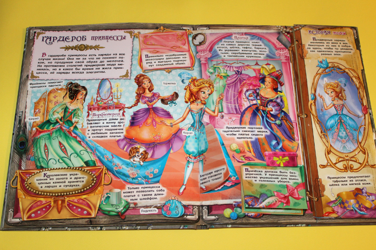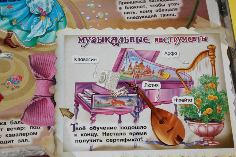 И вот близится Новый год, хочется порадовать дочку чем-то необычным, и я вспоминаю про эту прелесть. В ней есть всё, что обожают маленькие девочки: секретики, окошки, панорамки, украшения, платья, балы, рыцари, принцы, даже игра имеется и сертификат, в котором указывается, что маленькая читательница теперь тоже принцесса!