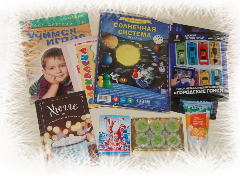 Второй подарок из сказочного северного города Архангельска, куда я непременно собираюсь съездить в ближайшие 10 лет )) Ириша, необыкновенно приятно было получить от тебя поздравление! Машинки сразу же были распакованы и присоединились к гонкам )) Белочка была наисвежайшей и съедена сразу же, я даже с детьми поделилась )) А я уселась листать Хюгге )) Думала, что книга совершенно о другом, а оказалось всё гораздо интереснее! Мой досуг на январь обеспечен. Игрой дети очень живо заинтересовались, она как раз подходит к нашей Географии. Всё остальное уже начали применять по назначению, особенно с чарующим мандариновым ароматом )) Спасибо тебе, что среди новогодней суматохи помнишь о нас!!!