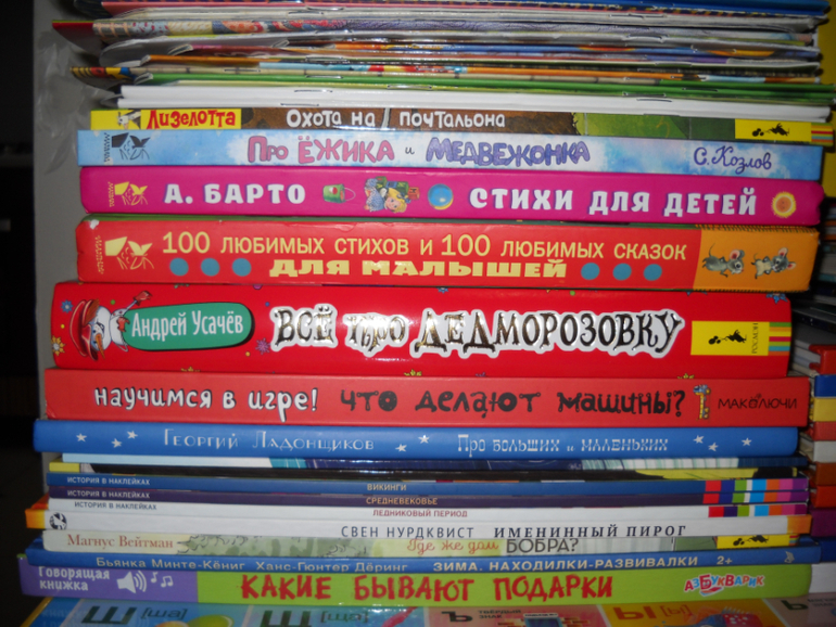 И целая россыпь тонких книжек-скрепок. На данный момент самые любимые зимние от Стрекозы: Дед мороз и Елка со стихами советских поэтов. На вырост получились две: Колеса и Лиса и журавль.