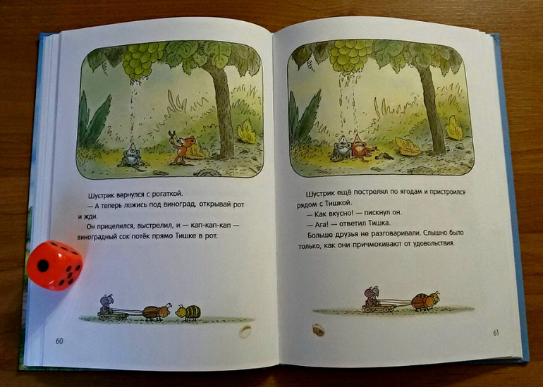 Итак, первая часть прочитана два раза и пока отложена в сторону, а мы все вместе приступаем ко второй книге. Мне кажется, текста тут еще меньше, а рассказы еще короче. Зато внизу каждой страницы ползут забавные букашки и занимаются различными своими делами. Дети очень любят их рассматривать, ведь там разворачивается своя отдельная история. Действия этих маленьких персонажей очень часто сочетаются с текстом: говориться про дождь, жуки идут с зонтами, в рассказах про зиму, они лепят снеговика или катаются на коньках.