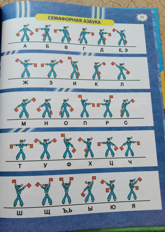 Ну и самое интересное и полезное наличие азбуки Морзе и семафорной азбуки