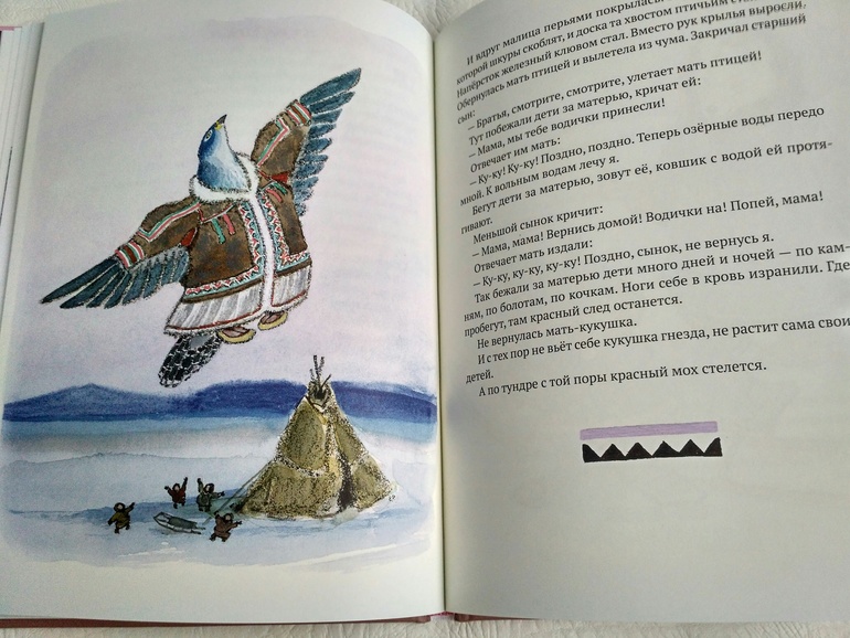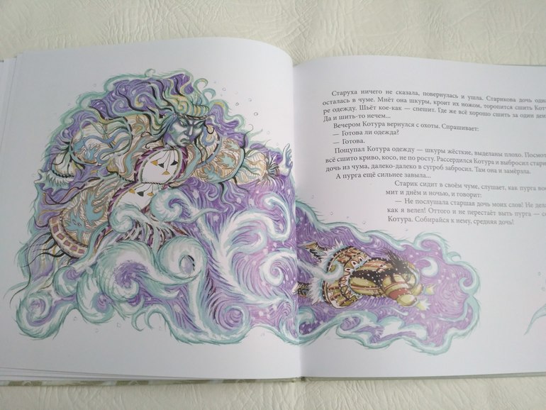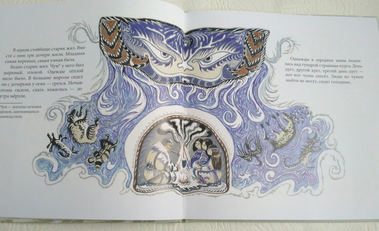 Первая сказка "Хозяин ветров" понравилась очень!! В ней рассказывается о том, как во время пурги, старик решил задобрить хозяина ветров Котуру и отдать ему в жёны свою старшую дочь. Но та должна выполнять определённые действия и во всем быть послушна мужу. Тогда хозяин Ветров успокоится ни пурга стихнет, а иначе вся деревня умрёт от голода в своих чумах. Но ни старшая, ни средняя дочь не справились, тогда настал черед младшей.