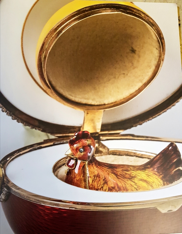 Первое пасхальное яйцо было создано по заказу Александа III, в подарок жене. После этого, карьера ювелира стремительно пошла вверх. Это было яйцо с золотым желтком, в нем курочка, а в курочке кулон