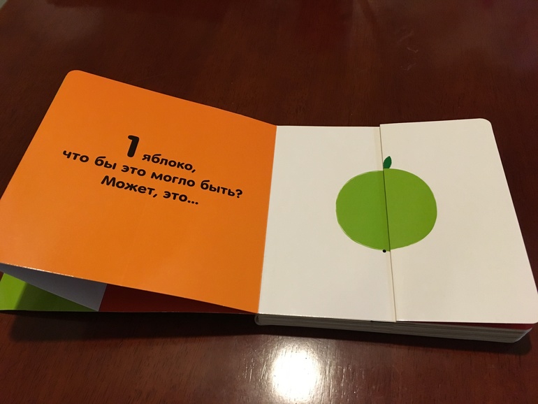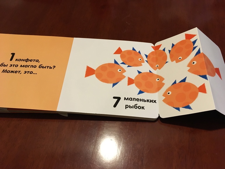 Следующая наша любимица Преврати один во множество издательство Поляндрия https://www.labirint.ru/books/554261/. Книжка игрушка, которая познакомит ребёнка со счетом 1-10, цветами, научит нестандартно смотреть на обычные вещи, например как яблоко может превратиться в 2-х зубастых крокодилов или бублик в кошку?! Волшебство да и только! Я только и успеваю переворачивать страницы, а ребёнок в полном восторге показывает как клацает зубами крокодил, безмолвно рыбки открывают рот..... Наши любимые развороты: