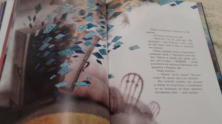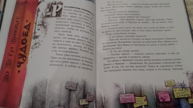 В книге рассказывается о мальчике Тимофее, который попал в книжный шкаф, а главный там книговой Викентий, случилась в шкафу беда, появился в нем чудоед, который съел все чудеса из книг, а какие книги могут быть без чудес, конечно же отправились на спасение, встречая по дороге звездочета и фей чудес. Как оказалось, шкаф еще и чихал, потому что Тимофей не убирался и не очищал свои любимые книги. ..оказалось, что из за чихания с таблички главного Чудоведа шкафа упала буква В и он стал Чудоедом и съел все чудеса, но букву вернули, Чудовед вернул чудеса, все стало прекрасно)) и конечно же в этот момент Тима проснулся))) это был сон, сон интересный и поучительный, он сразу решил проверить все ли его чудесные персонажи на месте и пообещал убраться в шкафу))