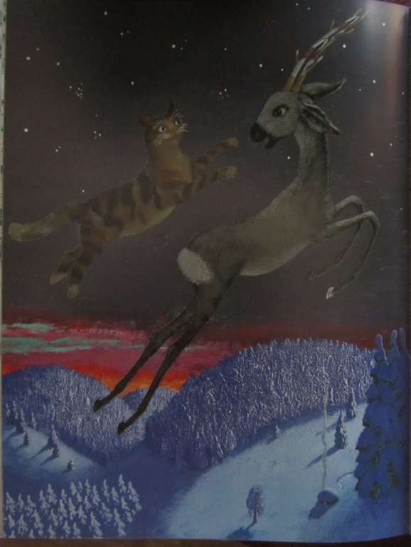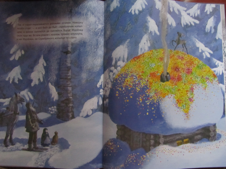 Я вот во всех книжках с этой сказкой ещё с детства прежде всего обращаю внимание именно на этот эпизод - где козлик выбивает из копытца драгоценные камни на крышу избы. У себя в воображении я сочиняла волшебные виды этих камней, и у Бычкова получилось почти как у меня )))![]()
