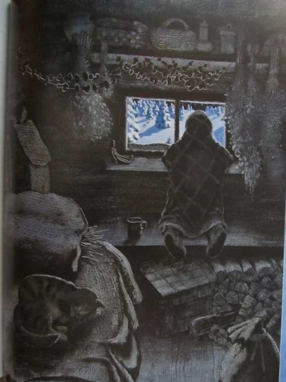 А это одна из любимых иллюстраций у меня ( когда Дарёнка ночью одна в избушке посреди леса увидела в окошке Серебряное копытце)![]()