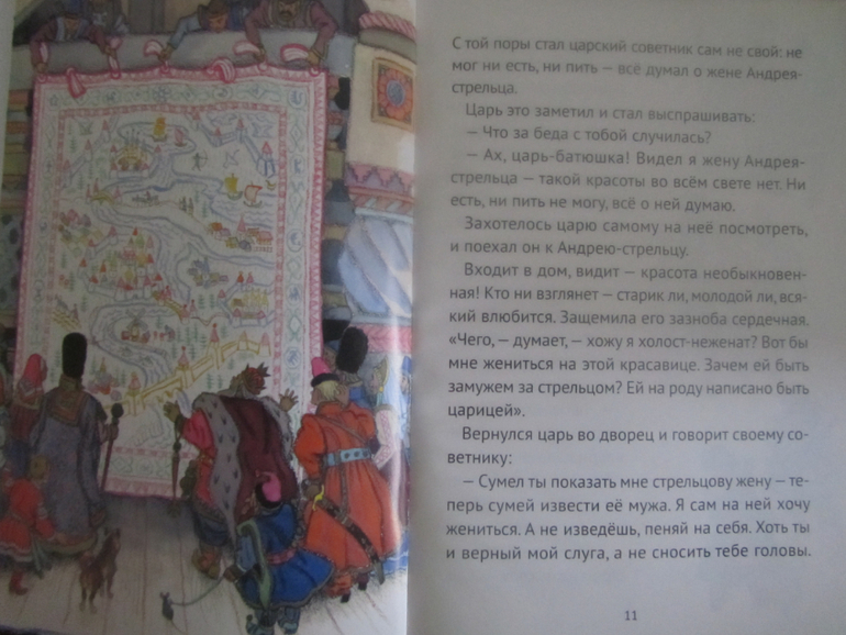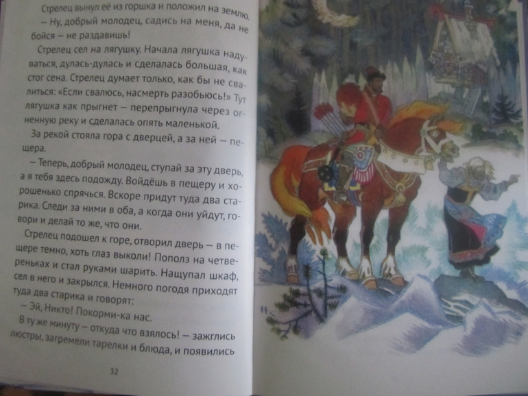 А так в принципе по цене и по качеству книга вполне устраивает и радует, что в твердом переплете (дольше сохранится 🙂 ) Бумага мелованная, тонкая (очень напоминает бумагу из серии Сказки на ночь от Лизы, помните такие?)Иллюстрации не совсем чёткие, но кажется они везде такие, цветопередача хорошая. Издательство Пальмира, у них целая серия таких сказок. Сама сказка довольно длинная ( как про Иван-царевича и серого волка, она кстати тоже есть в этой серии), довольно интересная. А я читая её, всё время вспоминала сказку в стихах Леонида Филатова про Федота стрельца (очень кстати рекомендую к прочтению).![]()