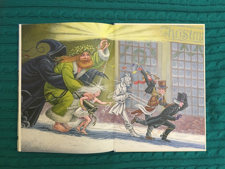 (Вот тут очень мне нравится как художник изобразил Марли и то с каким он упорством пытается "докричаться" до Скруджа, предупредить его... Этот огонь, позы, выражения лиц... )