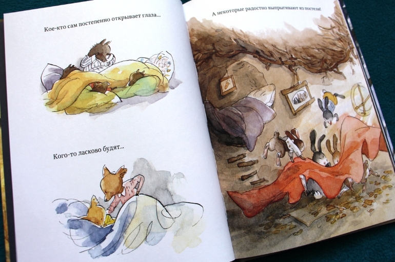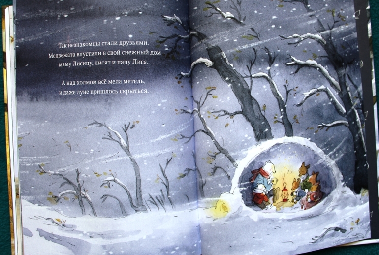 История простая, но тема затронута важная. Мы как раз пытаемся объяснить маленькому про то, как важно делиться, ну или хотя бы не прогонять брата с дивана. Сюжет рассказывает о маленьких лесных жителях - семействах лис, белок, зайцев. Вдруг в лесу началась буря, все жители спрятались по норкам и к ним стучатся братья медведи с просьбой спрятаться от бури. Но лесные жители испугались и не пустили их, только лисенок вынес медведям фонарь. Тогда медведи спрятались под снегом, у них получилась берлога. А лисам пришлось уйти из норки и они постучались теперь уже к медведям…