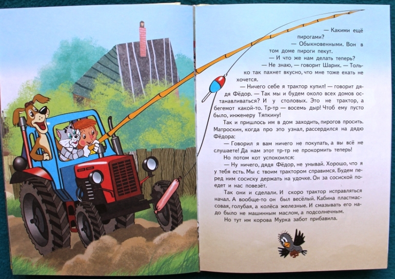 Книга хорошая. Успенский пишет простым детским языком, сюжет увлекательный и легко воспринимается даже в 3 года. Я часто (после 10 прочтений всей книги) уже просто открываю на любой главе и читаю - они хоть и связаны между собой смыслом, но уже все и так понятно. А старший, помню, вообще долгое время просил только главу про «тр-тр Митю» - это очень необычный трактор, который дядя Федор купил, когда они клад нашли. В мультике этого нет. По книге много моментов, которые не вошли в мультик, но они какие-то незначительные - читаешь и почти не замечаешь, что это новое. Вот трактор и профессор Семин (это он научил Шарика и Матроскина разговаривать) самые значительные.