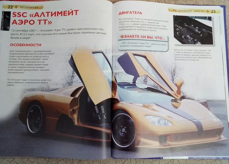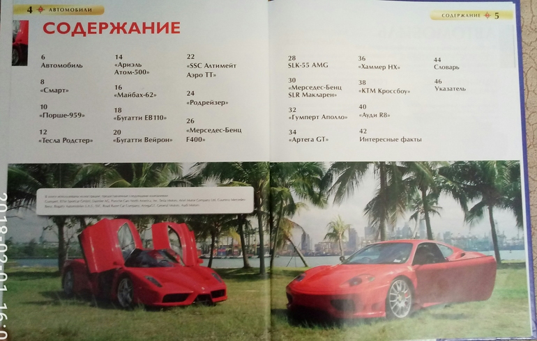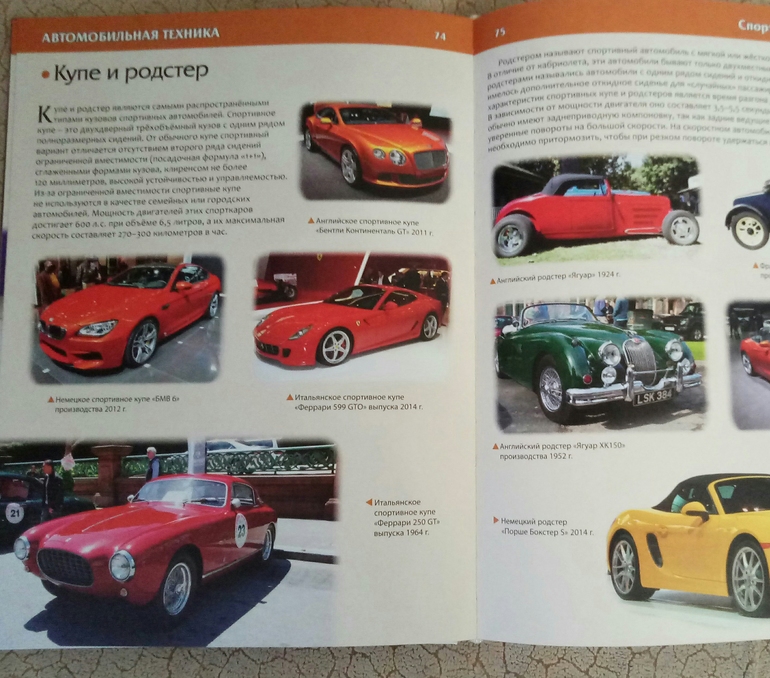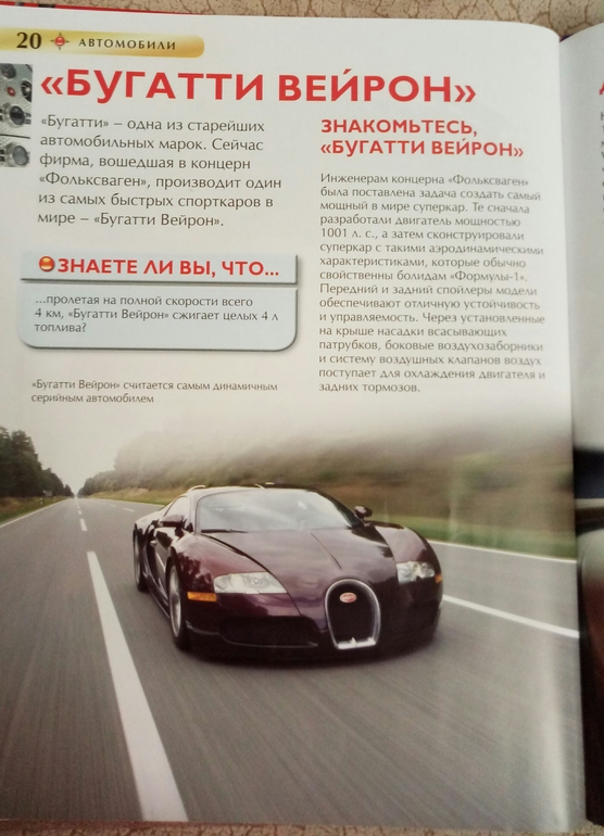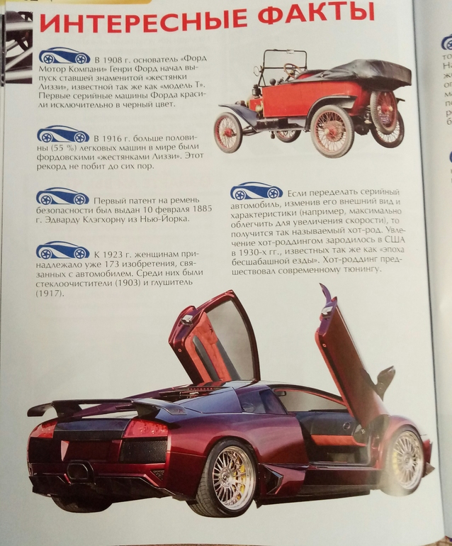 В начале немного общей информации про автомобили, кто придумал , у меня уже от зубов отскакивает Карл Бенц) Рассказывается о трех основных типах машин:городской автомобиль, спортивный автомобиль и суперкар и представлено несколько марок автомобилей, в основном это роскошные, гоночные машины, которые на улице вряд ли встретишь. Дана справочная информация, и небольшой любопытный факт.