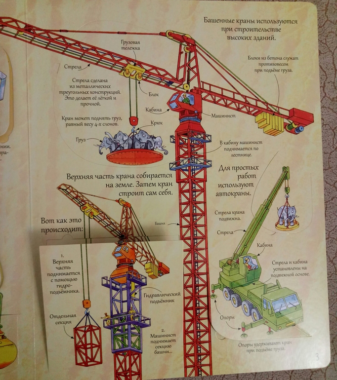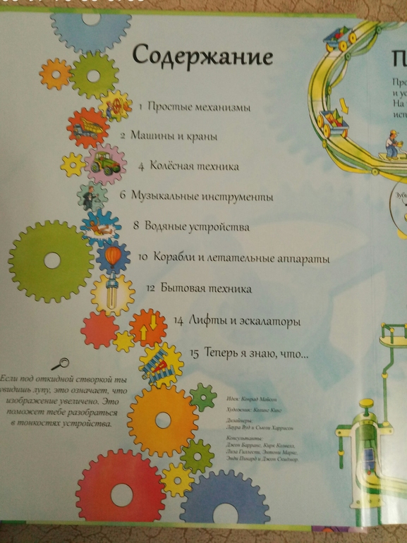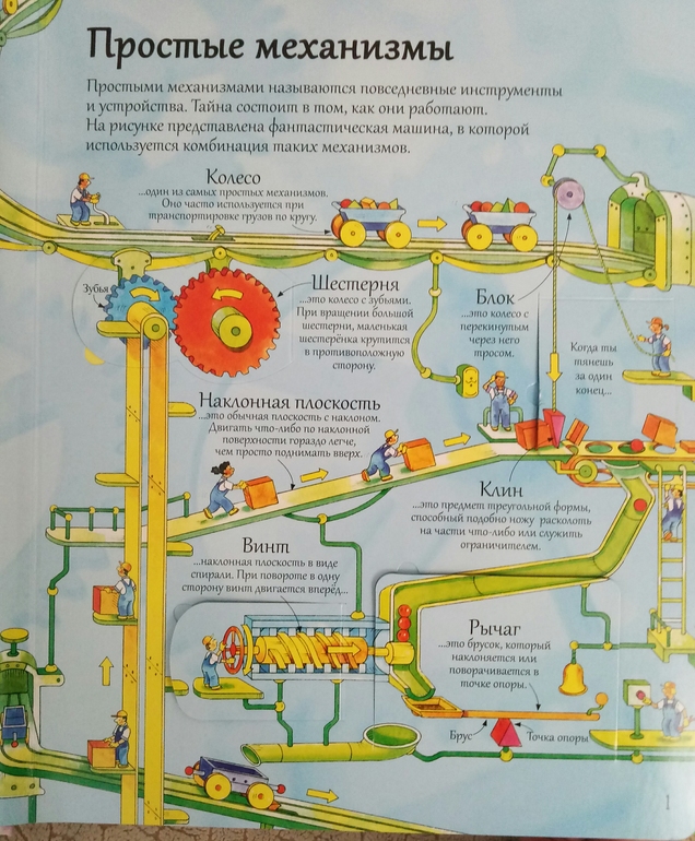 потому что в ней не только про машины, но и много много другого интересного) самый первый разворот знакомит с самыми простыми механизмами: блок, шестеренка, винт, рычаг. Мне кажется, мальчишкам нужно иметь представление, что это такое и как это работает, и как это выглядит